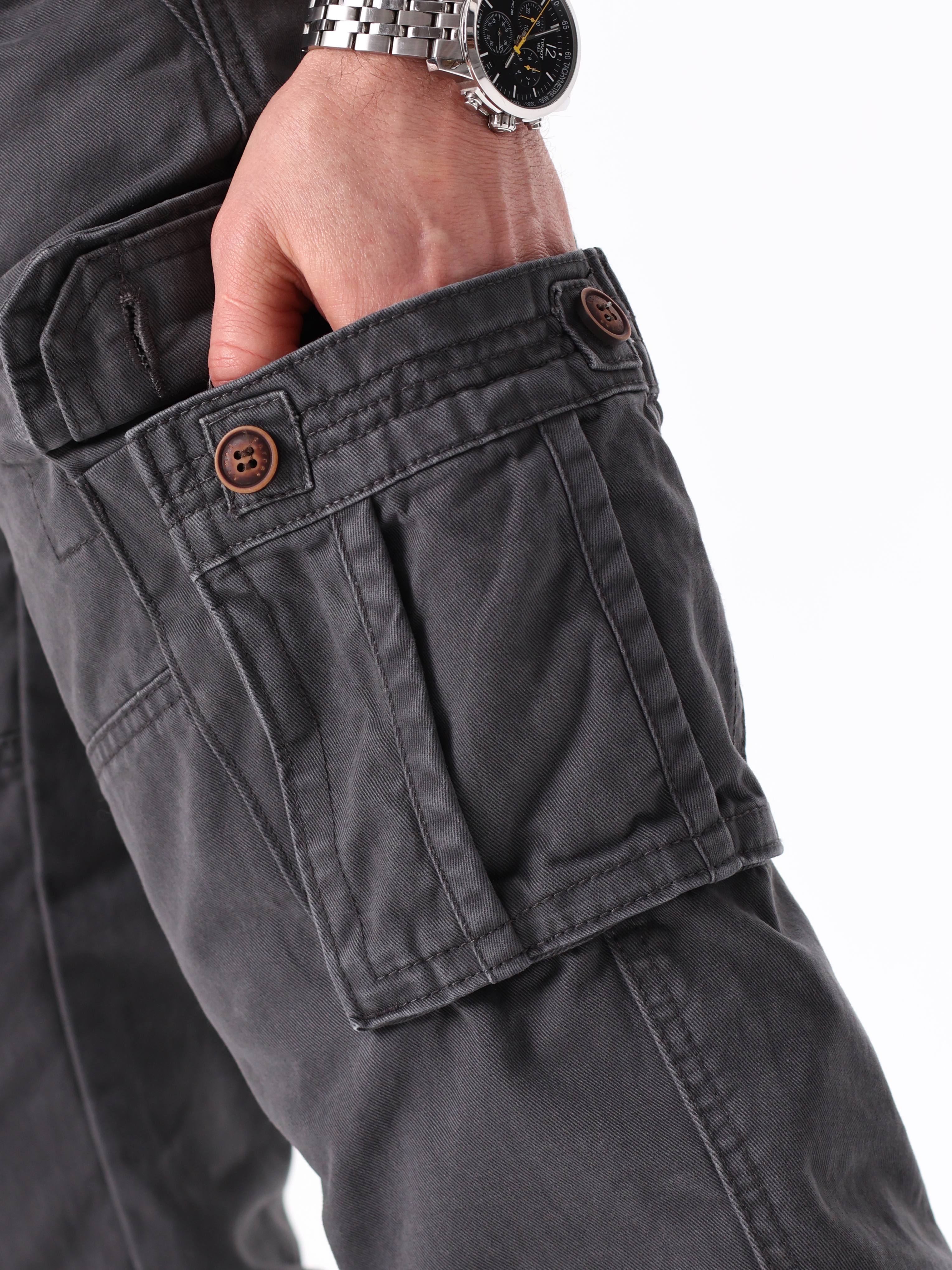 Брюки оснащены множеством карманов, что делает их практичными и функциональными. Данная модель имеет два прорезных кармана спереди и два прорезных кармана сзади с откидным верхом, а так же два накладных кармана с откидным верхом.